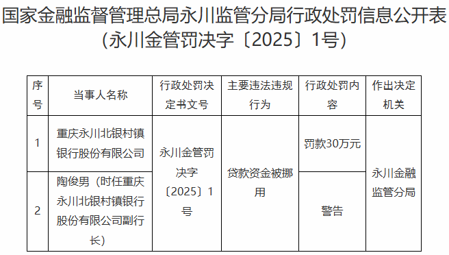 7月21日,北京的中国经济网是揭示扬丘安监督的惩罚信息的形式。并警告陶朱南(Chongqing Yongchuan Beiyin乡村乡镇银行有限公司)的副总裁。根据2024年北京银行(601169.SH)的年度报告,截至2024年12月31日,重庆的Yongchuan Beiyin农村开发银行的注册资本为8000万元,而北京银行的股权比率为70%。以下是原始文本: