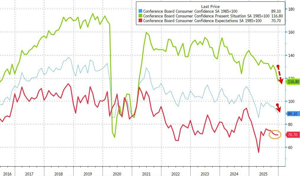 财联社12月24日电(编辑牛占林)由于美国物价高企以及特朗普大规模加征关税政策的影响,持续影响美国消费者信心。 12 月份的经济。美国研究机构世界大型企业联合会周二公布的初步调查数据显示,美国12月消费者信心指数跌至89.1,连续第五个月下降,低于11月修正后的92.9,为今年4月以来的最低水平。衡量美国人对短期收入、商业状况和就业市场的预期的指标保持在 70.7 不变,但仍低于 80——通常被视为可能预示经济衰退的迹象。该指标已连续11个月低于80。同时,消费者对生态现状的评价诺米下跌 9.5 点至 116.8。调查显示,尽管特朗普一再声称“通胀是一个骗局”,但物价上涨和通胀仍然是消费者最关心的问题,紧随其后的是关税。世界大型企业联合会首席经济学家达纳·彼得森指出:“消费者在回应中提到的经济因素仍然主要集中在价格和通胀、关税和贸易以及政治问题上。”他补充道:“不过,12 月份的调查问卷中提及移民、战争和个人理财相关话题的频率有所增加。”本月消费者对就业市场的前景也有所下降。 Ohon的一项世界大型企业联合会的调查显示,认为工作机会“充足”的消费者比例从11月份的28.2%下降至26.7%,而认为工作“难找”的消费者比例从20.1%上升至20.8%。美国劳工部上周公布的数据显示,非农部门增加64.011月有00个工作岗位,表现还算不错;然而,10月份就业人数大幅下降10.5万人。值得注意的是,11月失业率升至4.6%,创2021年以来新高。经济学家指出,由于特朗普关税的不确定性以及高利率的持续影响,企业普遍采取观望态度,导致劳动力市场陷入“低招聘、低解雇”的农业僵局。自3月份以来,每月仅新增35,000个就业岗位,而3月份同期为71,000个。美联储主席杰罗姆·鲍威尔最近表示,他预计这些就业数据将进一步下调。虽然整体情绪悲观,但相信明年经济不会陷入衰退的受访者比例实际上有所上升。 12月份的调查显示,受访者对家庭当前财务状况的评价为负面近四年来的第一次;而他们对未来金融状况的预期则达到一月份以来最乐观的水平。此外,美国政府周二公布的数据显示,美国第三季度实际GDP初值年化季率为4.3%,较第二季度的3.8%进一步改善。然而,经济学家预计,由于政府关闭和消费者支出下降,第四季度经济增长将放缓。它可能会掉落。 上一篇:着力提高制造业和生产性服务业融合发展水平 下一篇:没有了