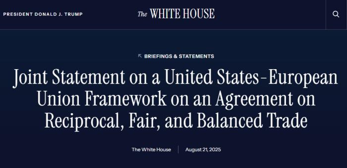 8月21日,中国新闻社。根据白宫官方网站的说法,当地时间8月21日,白宫发表声明,称美国和欧盟就贸易协定框架达成了一项协议。图像来源:白宫官方网站的屏幕截图。声明说,该协议标志着欧盟对美国关注的认可,并表明了双方共同承诺解决贸易失衡并释放共同经济实力的全部潜力。美国和欧洲的声明还指出,将该框架的这一协议作为加深合作过程的第一步。在hifaced中,它将继续扩大合作领域,继续改善市场加入,并进一步提高双边关系水平和投资关系。