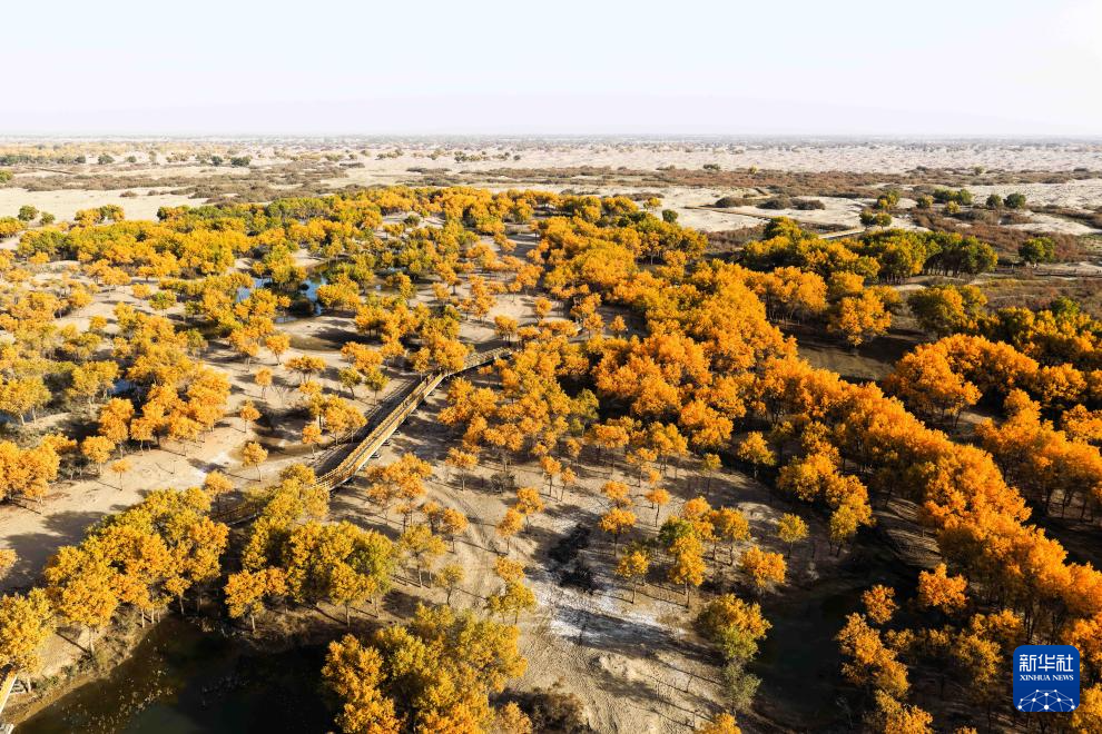 这是10月19日拍摄的新疆和田地区洛浦县洛滨胡杨景区(无人机照片)。如今,新疆和田地区的胡杨正进入最佳观赏季节。千变万化的胡杨林,水天相映,呈现出金秋美景。新华社记者 辛跃伟 摄